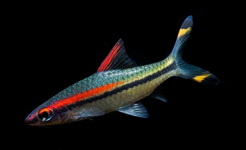 Description: This is an endangered fish characterized by a torpedo-shaped body with silver scales, a red line running from their snout, through the eye, back towards the middle of the body; and below the red line, a black line that runs the length of the fish to the tail. As they mature, a distinctive green/blue marking on top of the head develops. This species reaches a length of 15 centimetres (5.9 inch) and is a shoaling species