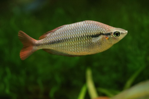Description: Larger melanotaenia hailing from Morehead river in cape York. They are a unique rainbow that have striking pinkish red finnage and body. When not fired up have a duller opalesk appearance. Males tend to be larger with more striking coloration on the body.